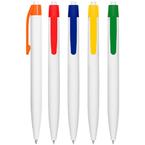Plástico. Bolígrafo con cuerpo y pulsador de color blanco y clip en color.