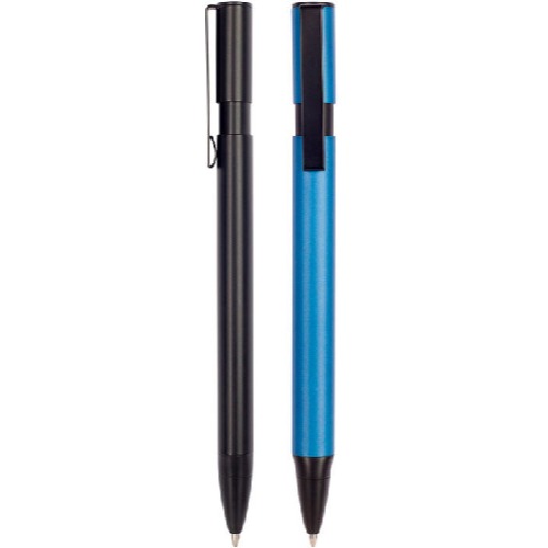 Metal. Formato ovalado. Cuerpo de color. Puntera, clip y pulsador de plástico negro.