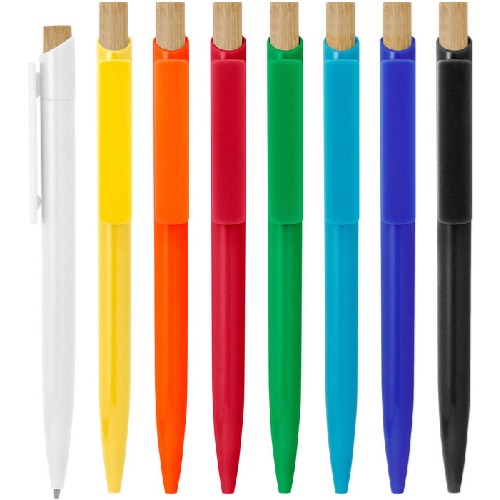 Bolígrafo retráctil con cuerpo en diferentes colores, pulsador de bambú y clip del mismo color del cuerpo.