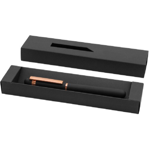 Metal. Cuerpo de aluminio, acabado engomado color negro, muy suave al tacto. Roller. Apertura con tapa a presión. Clip y anillos metálicos color cobre. Decapa cobre tanto en el cuerpo como en la tapa (grabado exclusivo en nuestro taller). Presentación en caja de regalo.