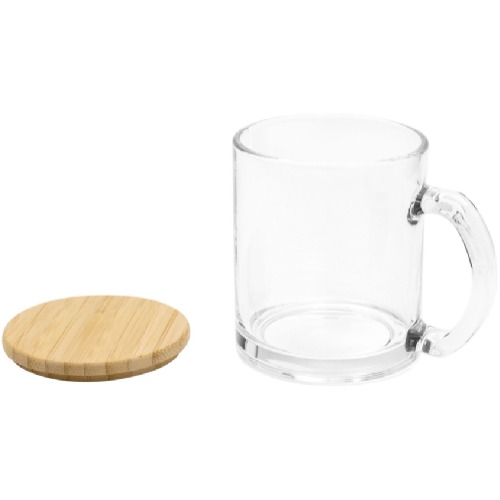 Taza de vidrio con tapa de bambú barnizado.